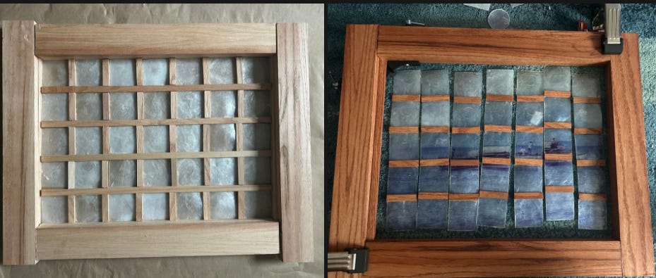 Even though all the signs pointed to me making a wind chime, I ignored them. When I began researching them, I couldn’t figure out how I would make my wind chime an original sculpture instead of a generic wind chime. I decided that that art piece needed time to unravel, and without a second thought, I abandoned it. As I researched the capiz shell windchimes, I discovered another use for those shells in the Philippines: glass for windows. I fell in love with these windows and knew this was what I wanted to make for the show. I envisioned using phototransfer on 35 square-cut capiz shells, with a stained oak wood frame. I would use one photograph from my mom's or lola’s archive and break that photo up into 35 squares, creating a grid. It took one YouTube Short to convince me. I was making a window. (I should have known that a YouTube Short is NOT a reliable source to develop this new skill in woodwork —especially 3.5 weeks before the exhibition).